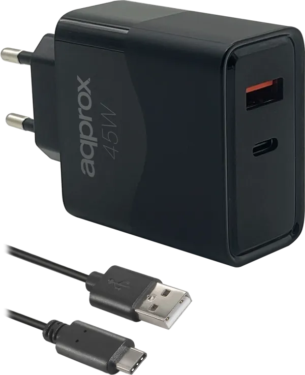 CARGADOR USB DE VIAJE/PARED 1xUSB/USB-C + CABLE USB-A A USB-C 45W NEGRO APPROX